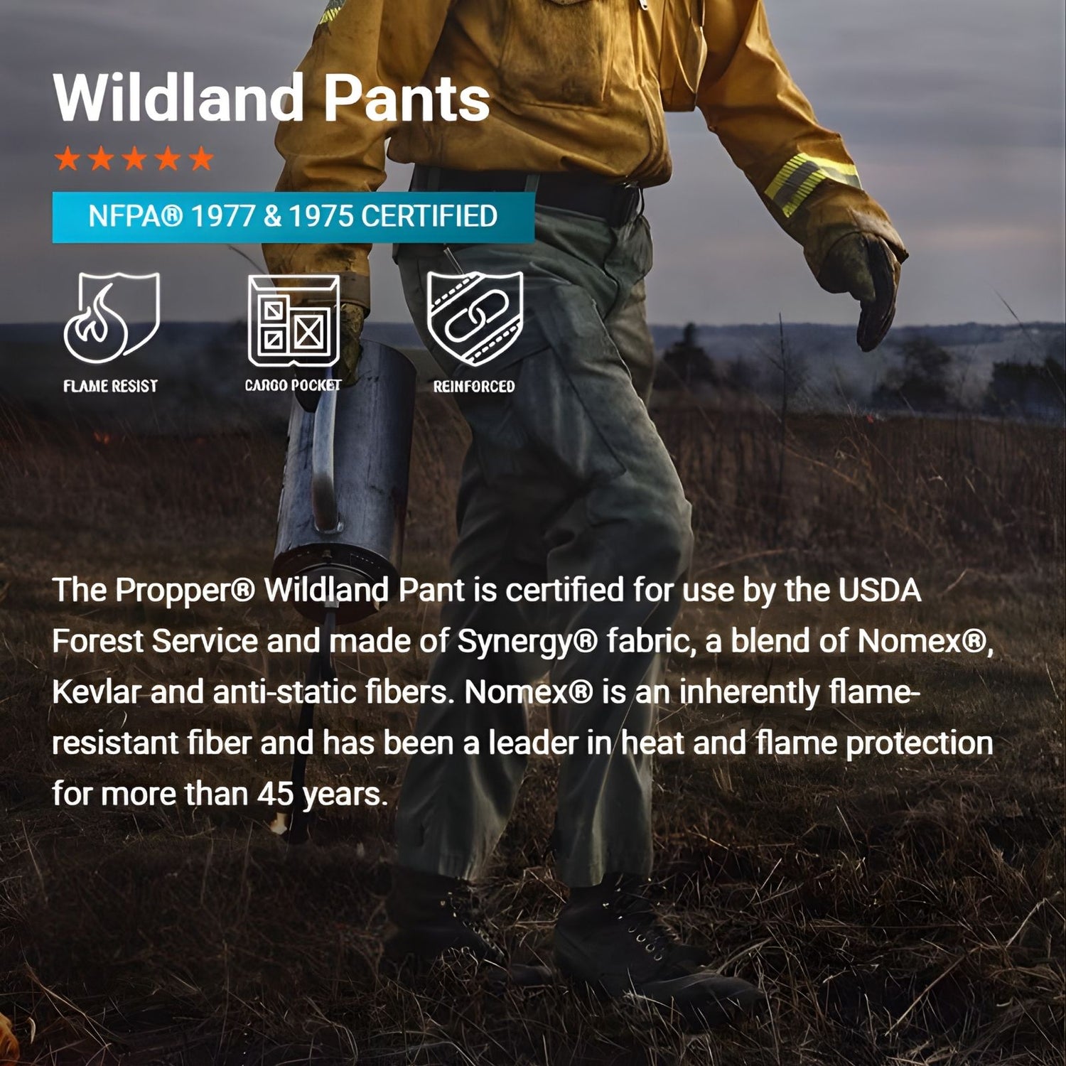 The Propper® Wildland Pant is certified for use by the USDA Forest Service and made of Synergy® fabric, a blend of Nomex®, Kevlar and anti-static fibers. Nomex® is an inherently flame-resistant fiber and has been a leader in heat and flame protection for more than 45 years.