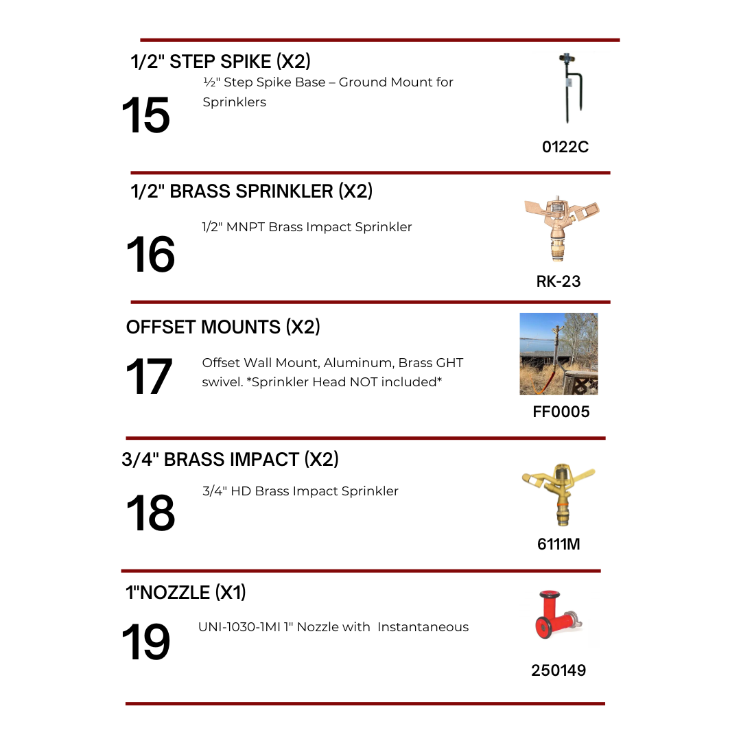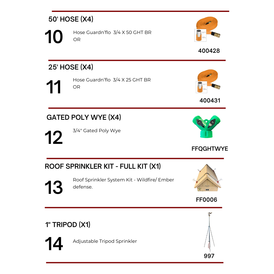 This package includes a high-performance pump, roof-mounted sprinklers, tripod sprinklers, hoses, and fittings, ensuring a complete and reliable fire protection setup. The system is easy to install, with durable components engineered for long-term use in wildfire-prone areas.