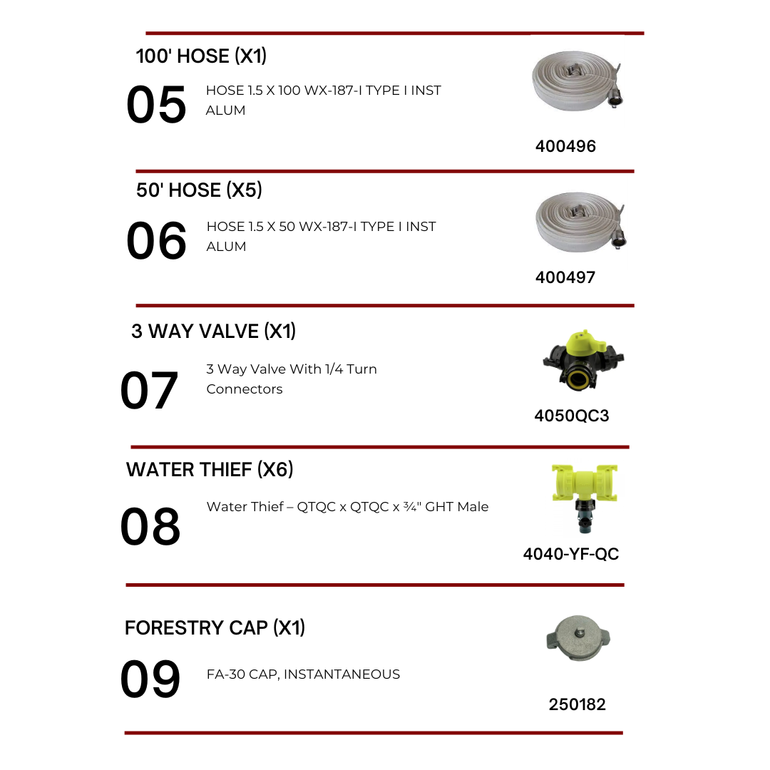 Fittings & Valves: Quick-connect forestry fittings, gated poly wyes, and water thieves