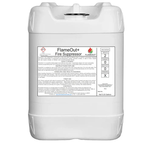 FlameOut™ liquid is an extremely effective fire suppressing agent for use on Class A, B, and D fires. This new generation chemical replaces foams, halon, and other conventional chemicals. It is safe for firemen, victims, and the environment. Tested by professional firefighters, the chemical has earned EPA listing and is currently undergoing testing for UL approval.
